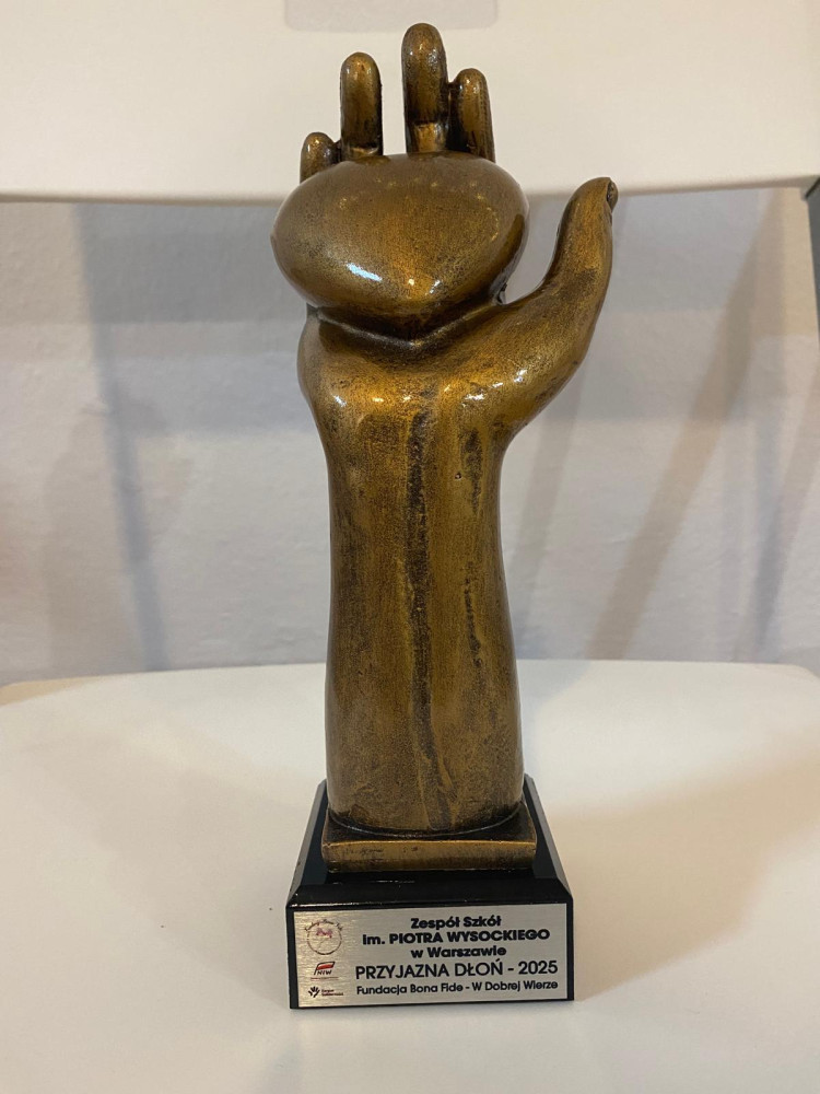 Miło nam poinformować, że Zespół Szkół im. Piotra Wysockiego otrzymał 19 grudnia 2025 roku, od Fundacji Bona Fide statuetką „ Przyjazna Dłoń”.